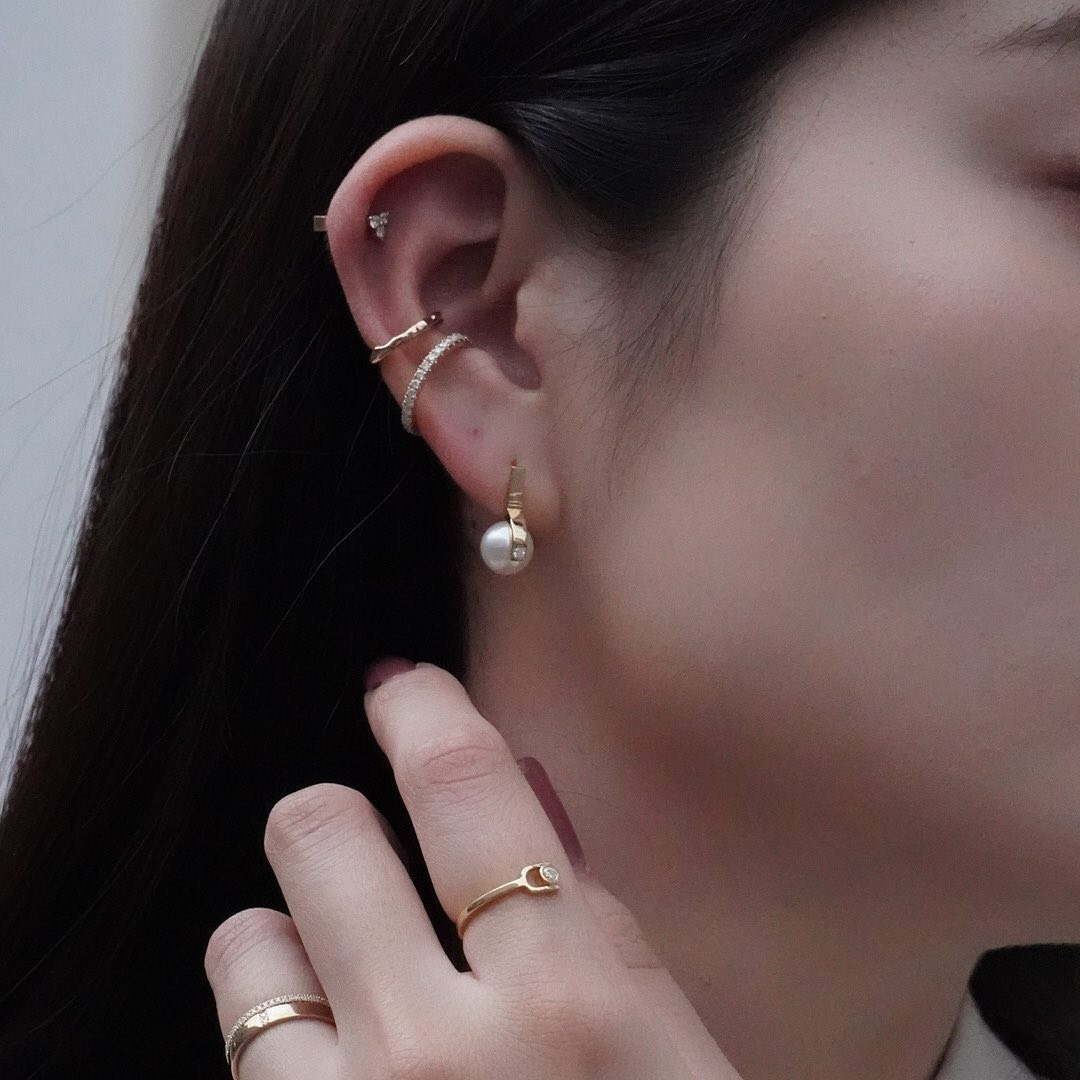 初めてイヤーカフを購入しました。イヤリングと違い痛くもならず、軽いので着けているのを忘れるほどですが、イヤフォンをしても気にならず落ちずでした。ふと鏡を見た時にキラキラと輝いていてとても嬉しい気持ちになりました。18kと迷いましたが10kのMサイズにしました。気軽に使えるし、買って良かったです。指が太めなので指輪には使えずだったのが残念です。