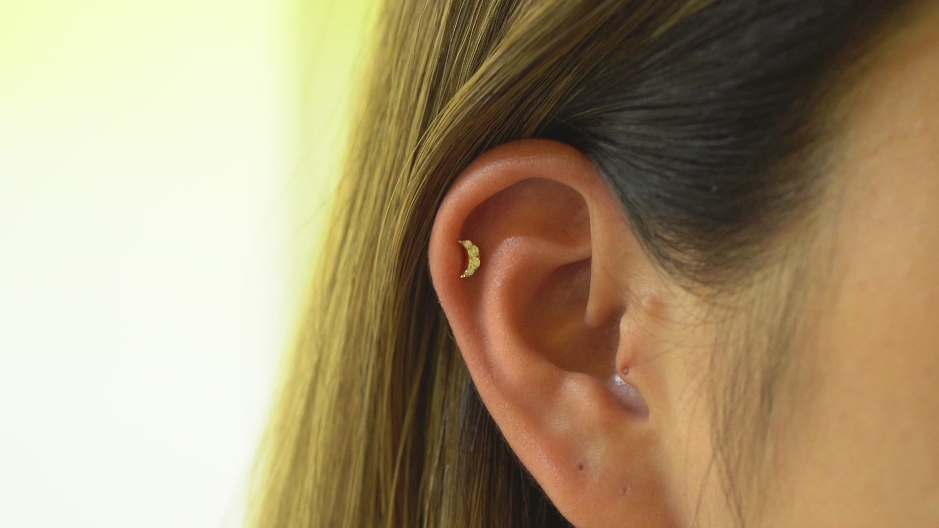 三日月をモチーフにしたボディーピアス。シャフト(ポスト)とネジ式のキャッチは自社規格で製造。華奢で定番なデザインなので、使い勝手が良く、ずっと身につけれるピアスです。ピアスが外れるのが心配な方や、ずっとつけっぱなしにしたい方におすすめです。