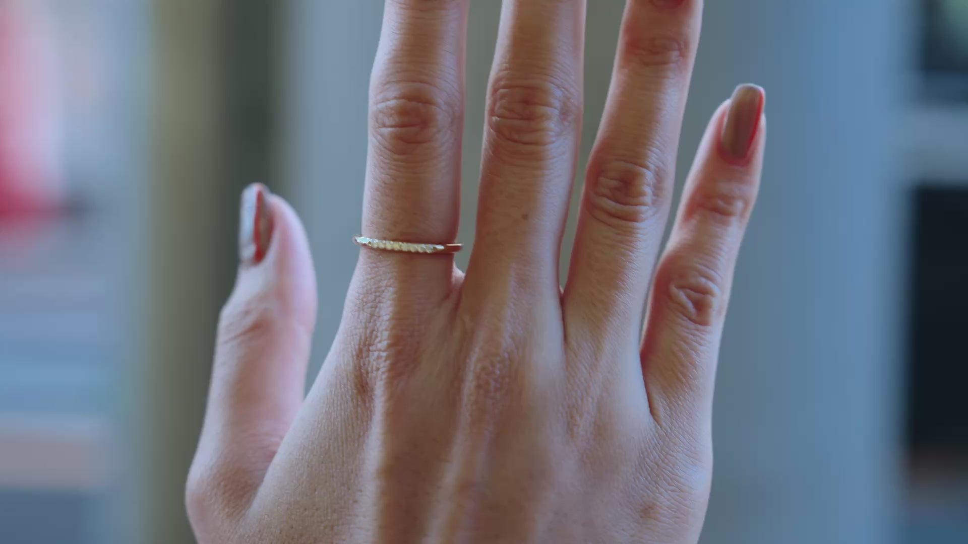 ストレートラインのリングに小さなモアサナイトが並んだシンプルなアイテム。ひとつ着けはもちろん、重ね付けにもおすすめ。石の引っ掛かりも気にならないので、日常使いのリングコーディネートに取り入れてみて。