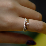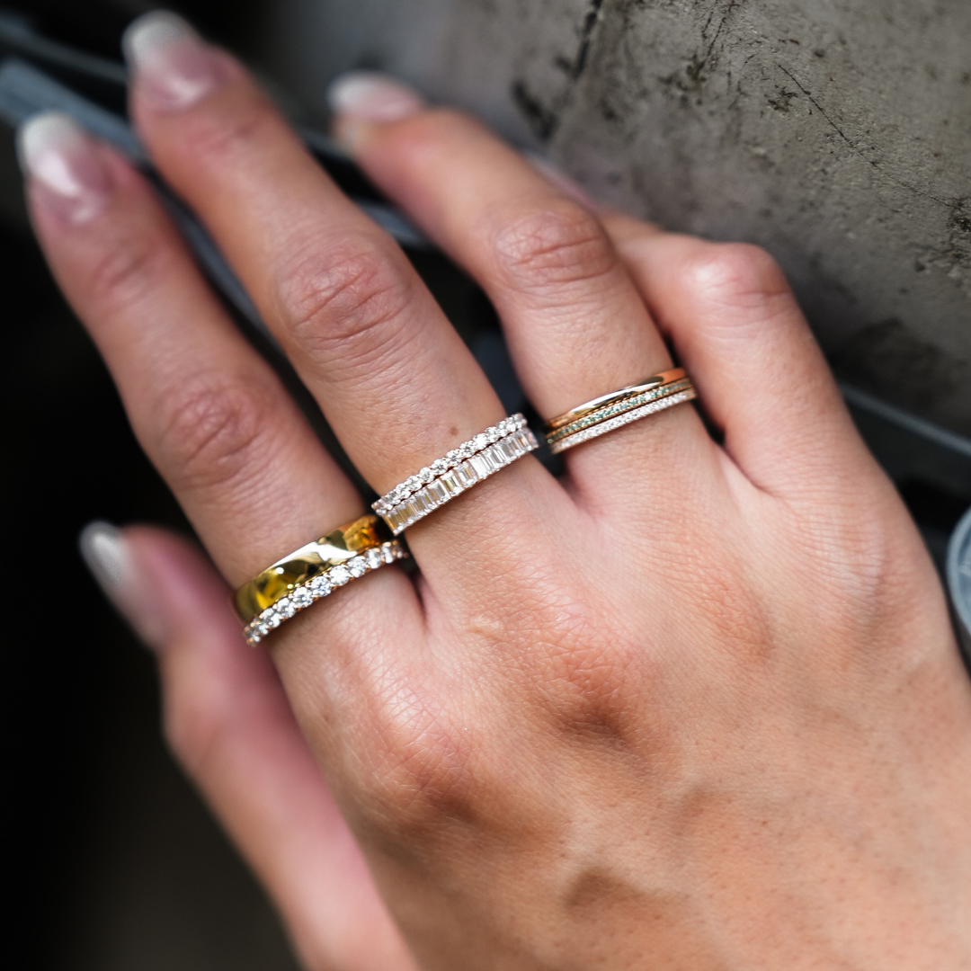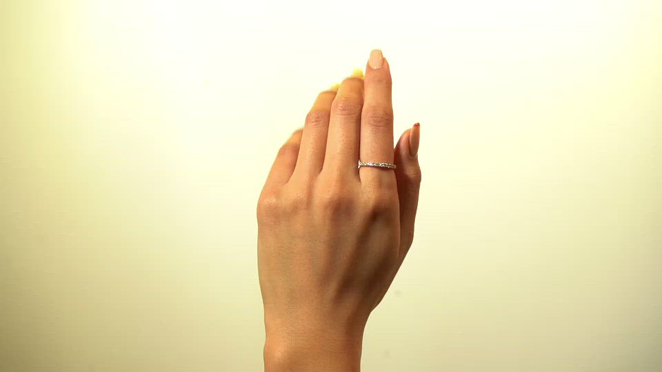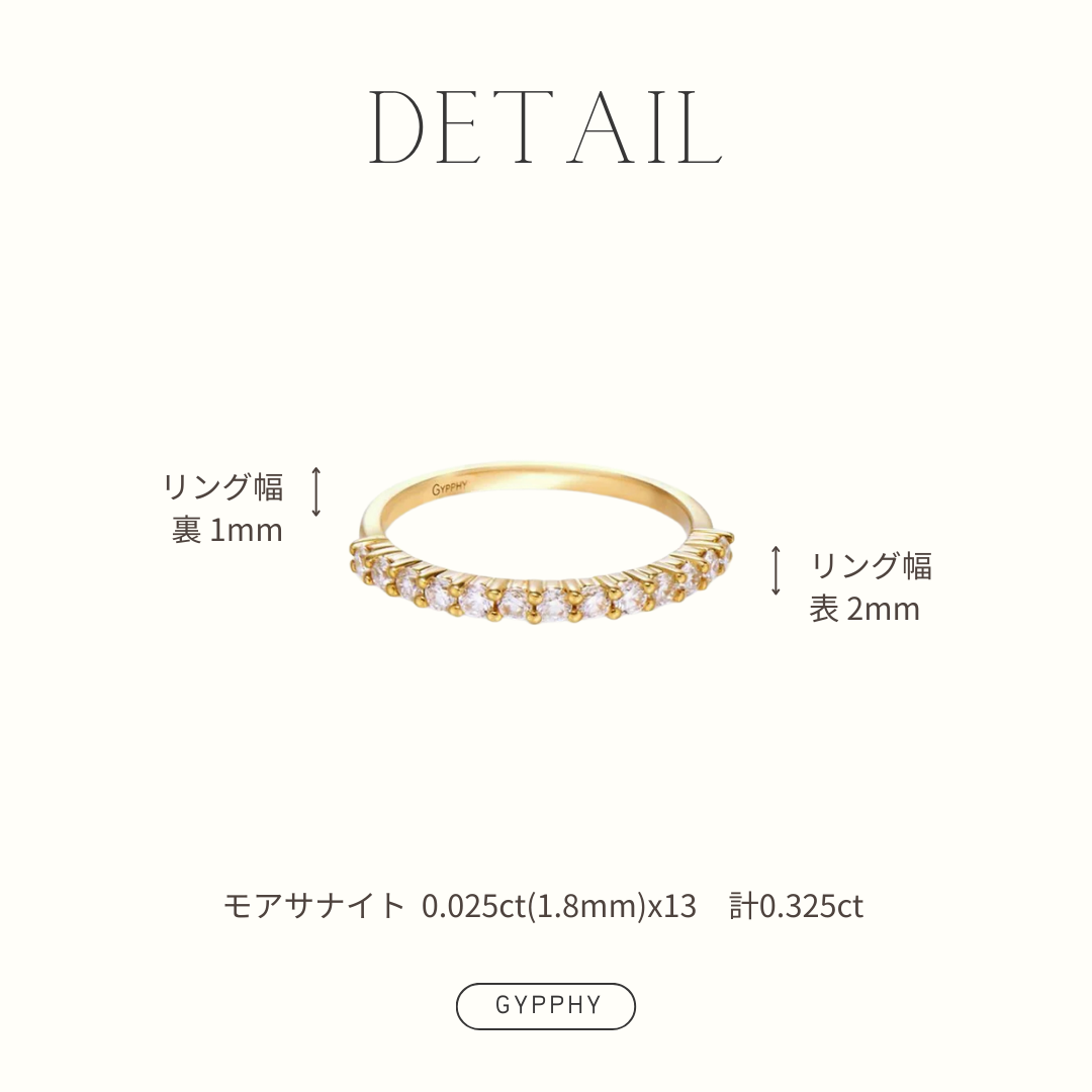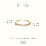 ストレートラインにモアサナイトを並べた、定番のハーフエタニティリング。均一に並ぶ輝きが、指先に上品で華やかな印象を添えます。シーンを問わず身につけやすい、タイムレスな美しさが魅力の一本です。