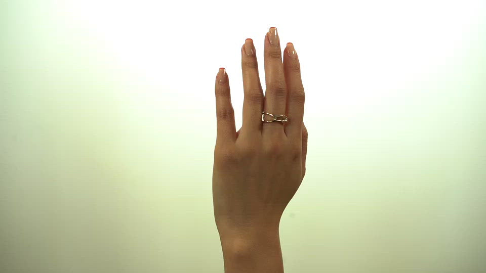 2つのスクエア状のアームが横方面に交差し、モアサナイトを支え合うような形状が特徴のデザイン。シンプルに無駄のないラインと、モアサナイトが浮いているようなフォルムが楽しめます。