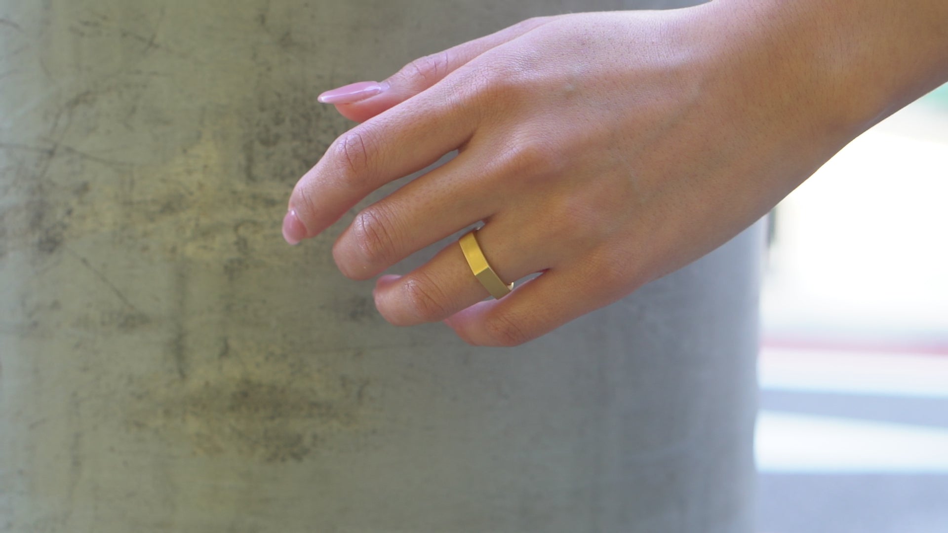上向の三角形をモチーフにした幅太めの結婚指輪。金素材をふんだんに使った高級感のある贅沢なリング。またマット加工に仕上げることで傷が目立ちにくいデザインとなっています。