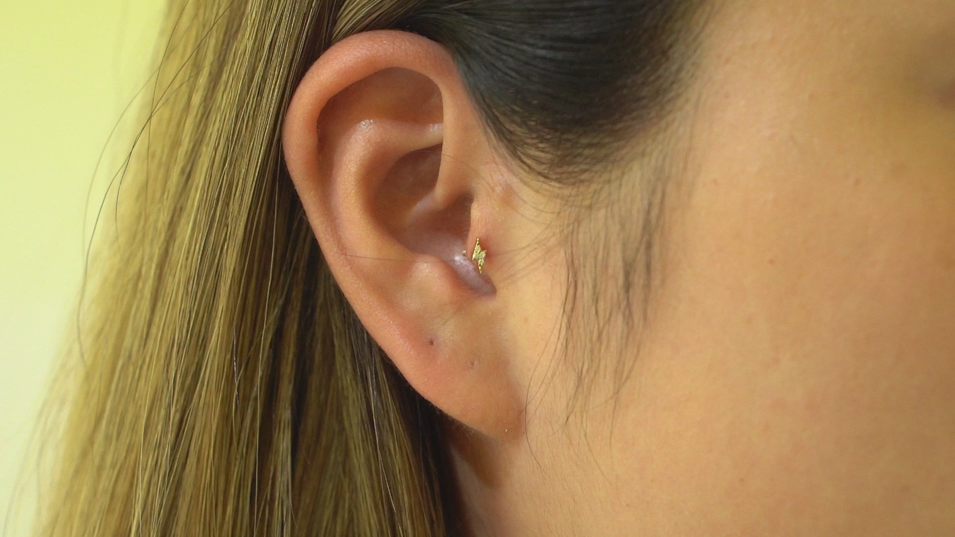 雷をモチーフにしたボディーピアス。シャフト(ポスト)とネジ式のキャッチは自社規格で製造。華奢で定番なデザインなので、使い勝手が良く、ずっと身につけれるピアスです。ピアスが外れるのが心配な方や、ずっとつけっぱなしにしたい方におすすめです。