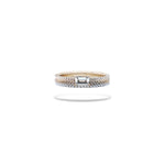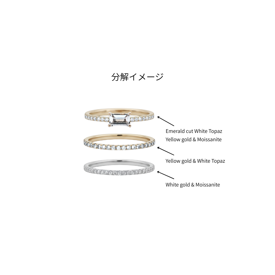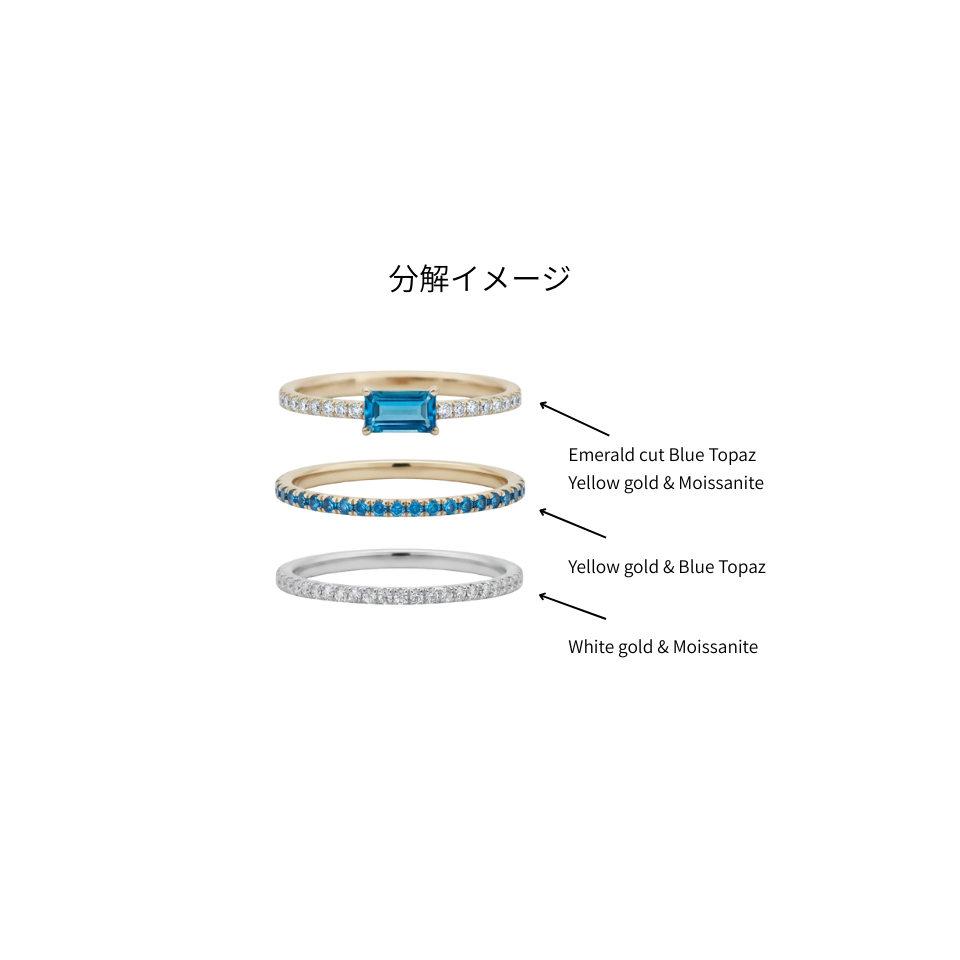 センターには、エメラルドカットのトパーズをセッティング。その両側をモアサナイトとトパーズが繊細に並び、まるで光が層をなして広がるように静かに輝きを放ちます。フルエタニティタイプで、豪華な仕上がりになっています。
