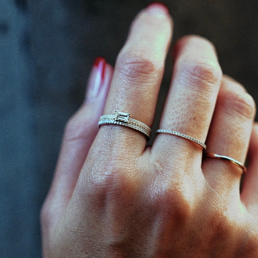 ミニマルで洗練されたデザインながら、存在感のあるセンターストーンが手元を凛と照らし、日常にも特別な日にも寄り添うジュエリーです。