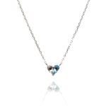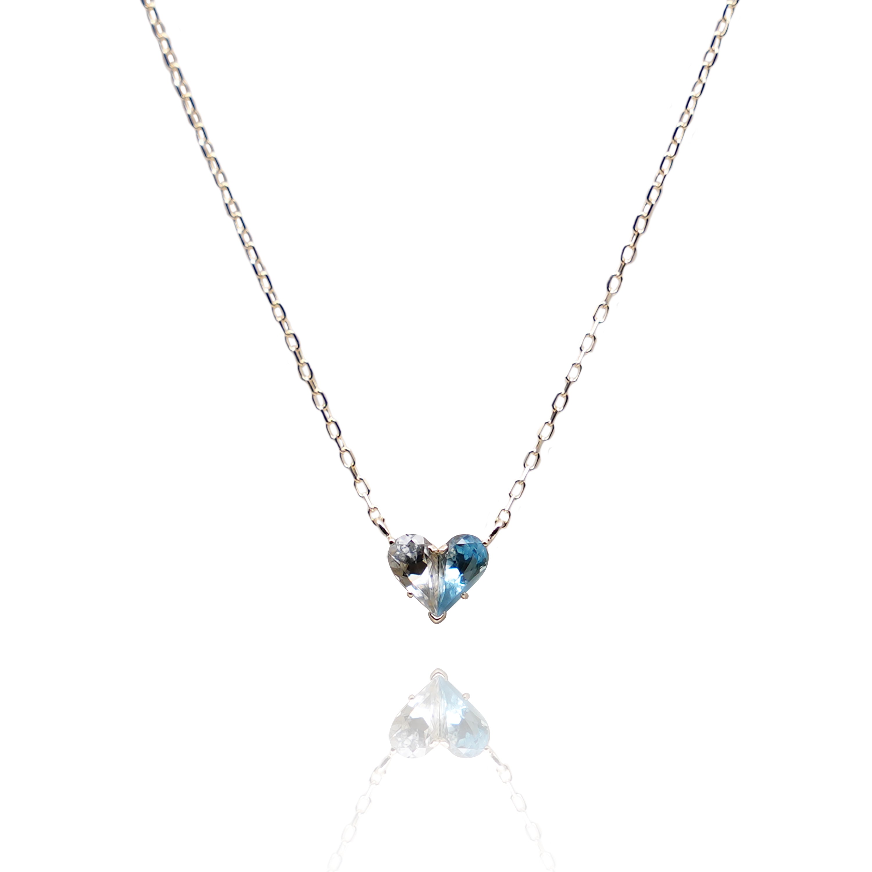 ドロップカットのホワイトトパーズとブルートパーズ、異なる輝きをもつふたつの石を向かい合わせに配し、寄り添うことでひとつのハートを描いています。