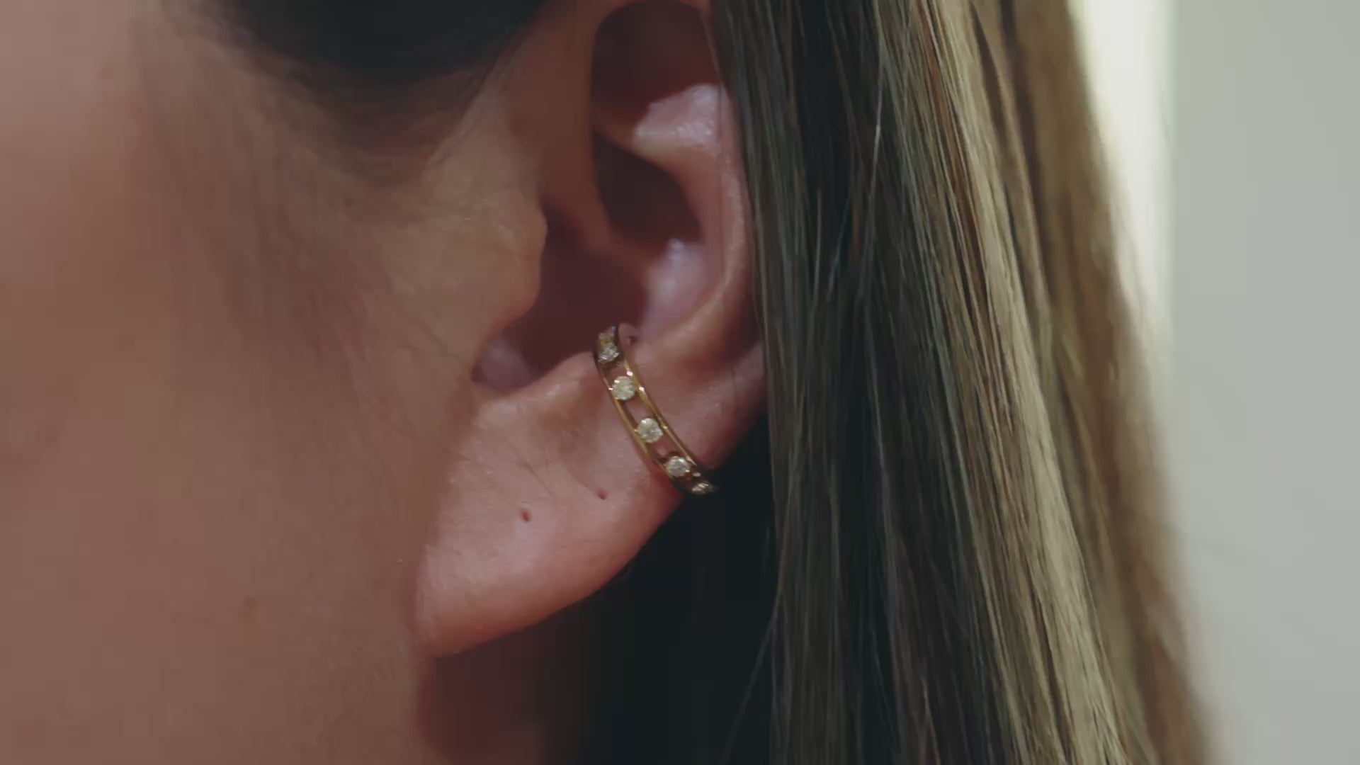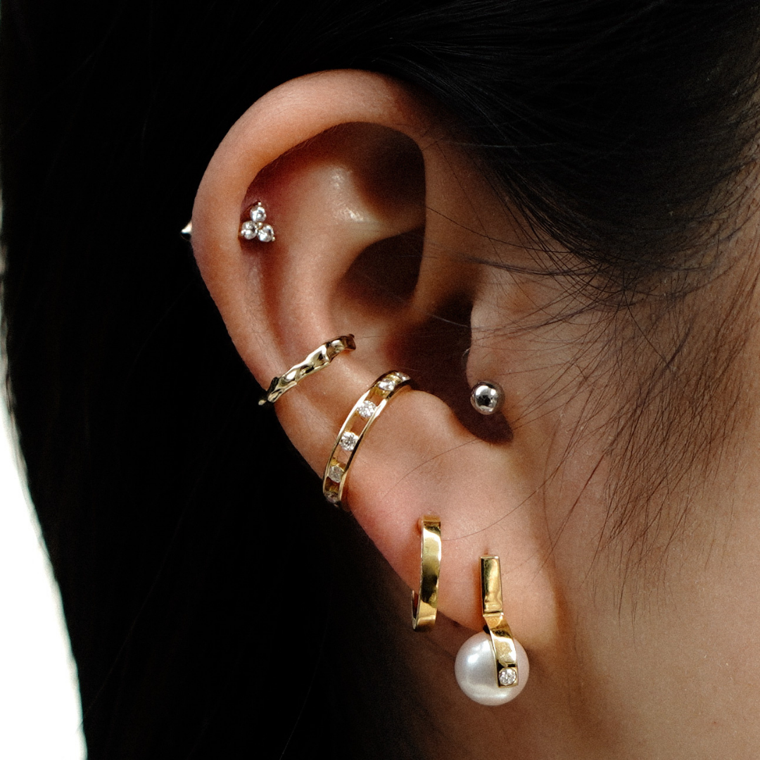 モアサナイトを等間隔に配し、シンプルながらも存在感のあるデザイン。ひとつ身に着けただけで耳元の印象が一気に変わります。また、3号サイズのピンキーリングとしても楽しんでいただけます。カジュアルからきれいめまで、あらゆるコーディネートとも相性抜群です。